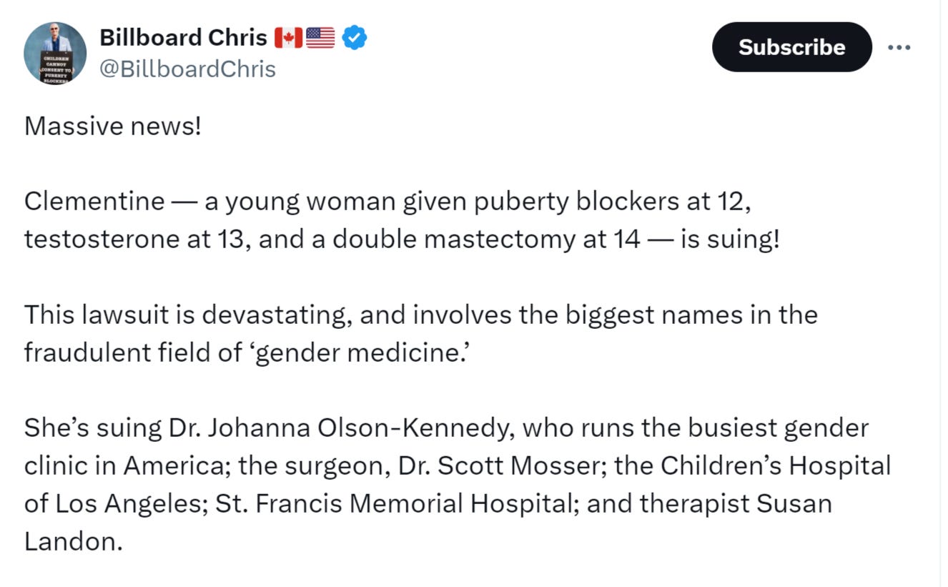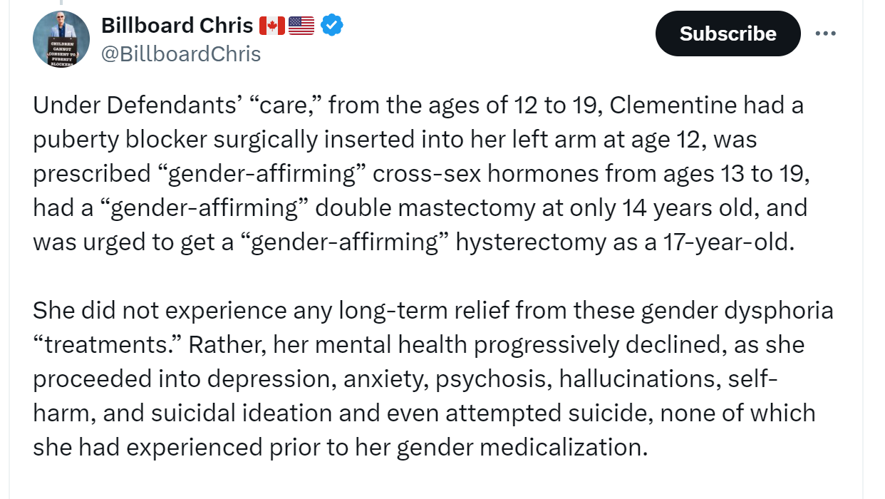 Even worse, Defendants made numerous material misrepresentations in order to convince Clementine’s parents to agree to puberty blockers, such as assuring them that puberty blockers are “completely reversible,” and cross-sex hormones, including asserting that Clementine would commit suicide if she did not begin taking testosterone.