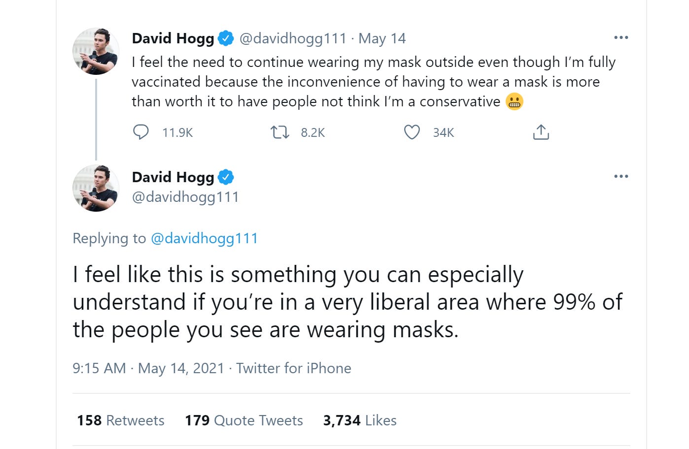 stop and really parse this. this is someone engaging in self-harm for no useful purpose because signaling his identity as a “liberal” as defined by engaging in self harm is more important to him than science, sense, or self-identity.