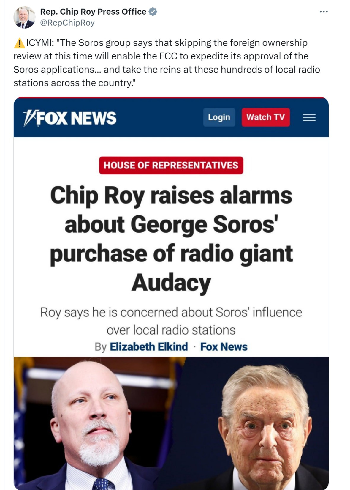 soros is buying ~300 radio stations in nearly 50 markets. it’s all going to be “local radio.” he’s asking to skip the “foreign ownership review” in time for the coming election.