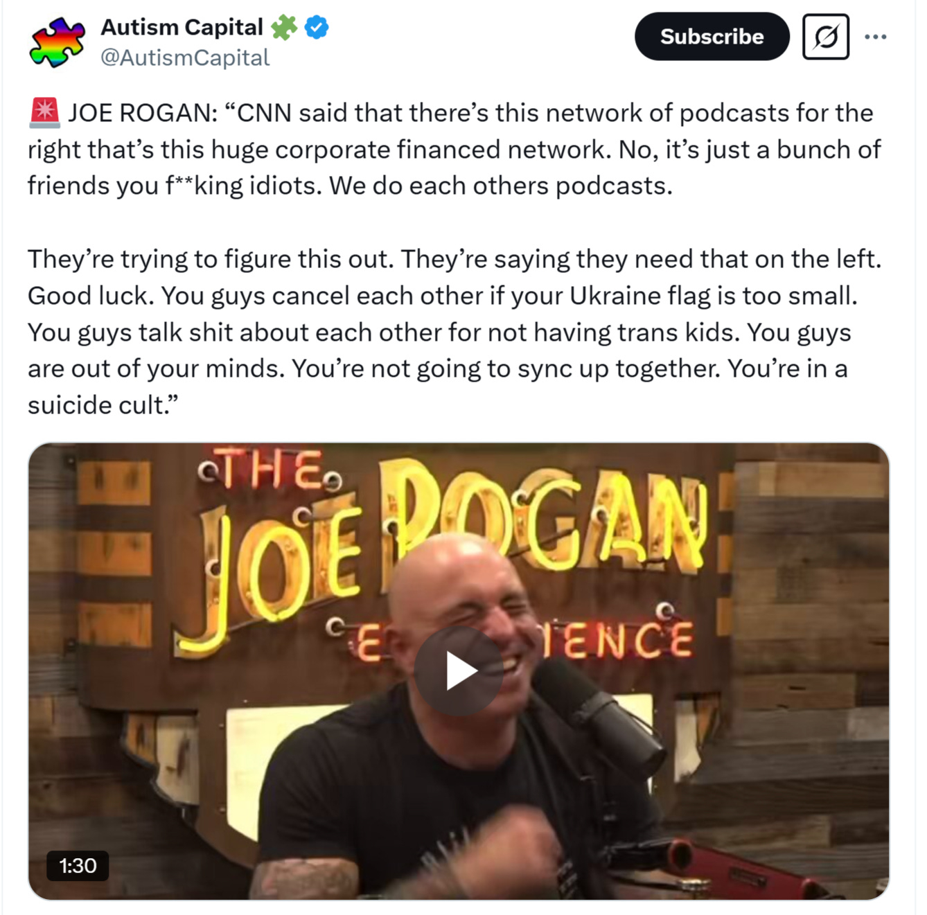 they are simply one big coalition of awful, wincing takes, self-own, and vitriolic hatred for and intolerance of anything that is not “just like them.” break ranks on the tiniest of points of doctrine, and you’re out of the club, excommunicated, excoriated, and apostate and the whole of the longhouse shall shun and shame thee evermore.