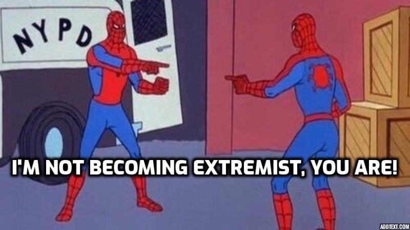 but here’s the fun twist: as they are propelled ever faster toward extremism in order to defend the priors that underpin their sense of self, they do not experience it as movement.