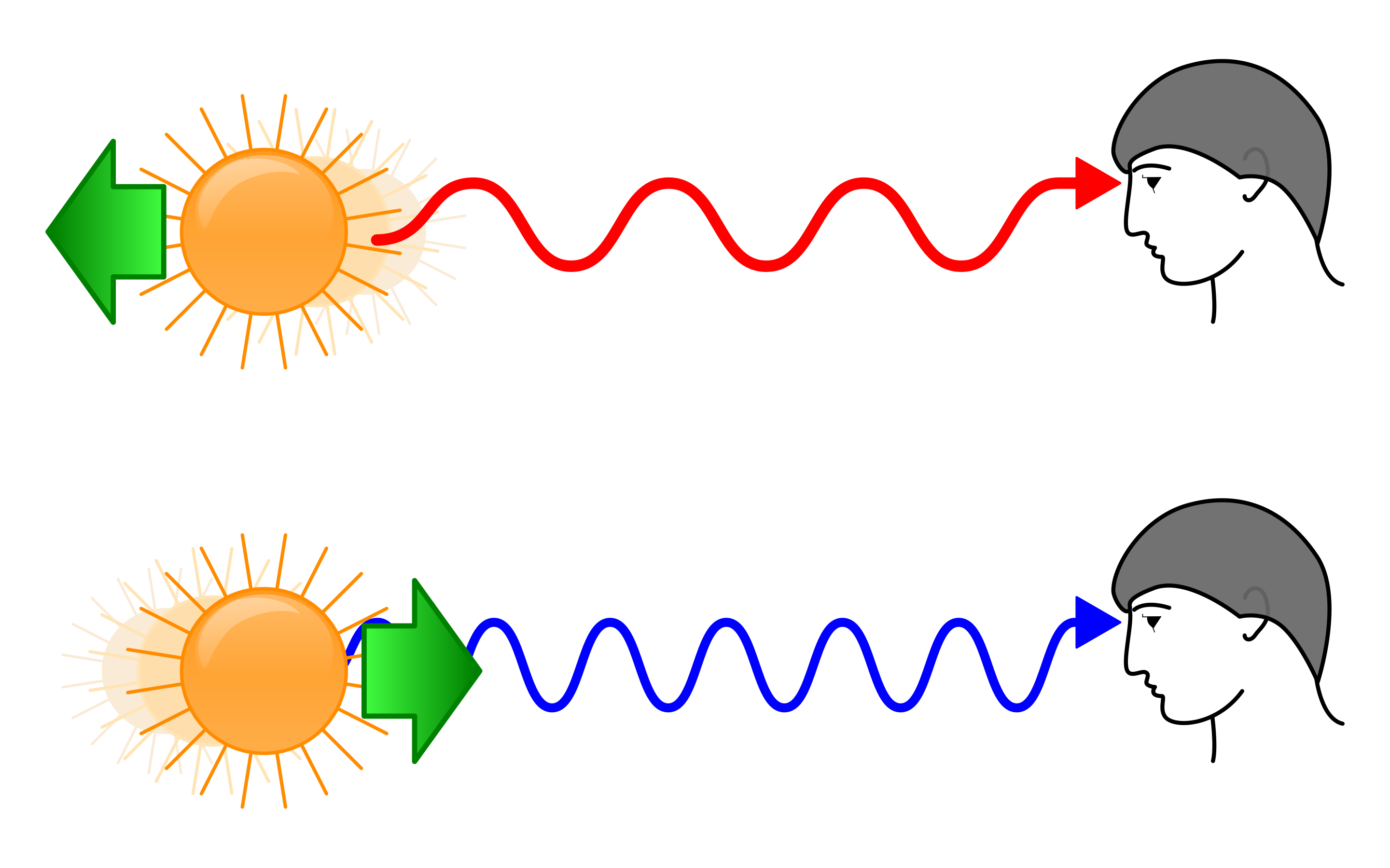 if two objects are moving apart, the perceived light emitted by either and received by the other shifts red. yellow becomes orange, orange red, and red infrared. you’re going to see this. but you cannot tell from this fact which of you is moving or how fast, only that separation is occurring or accelerating.