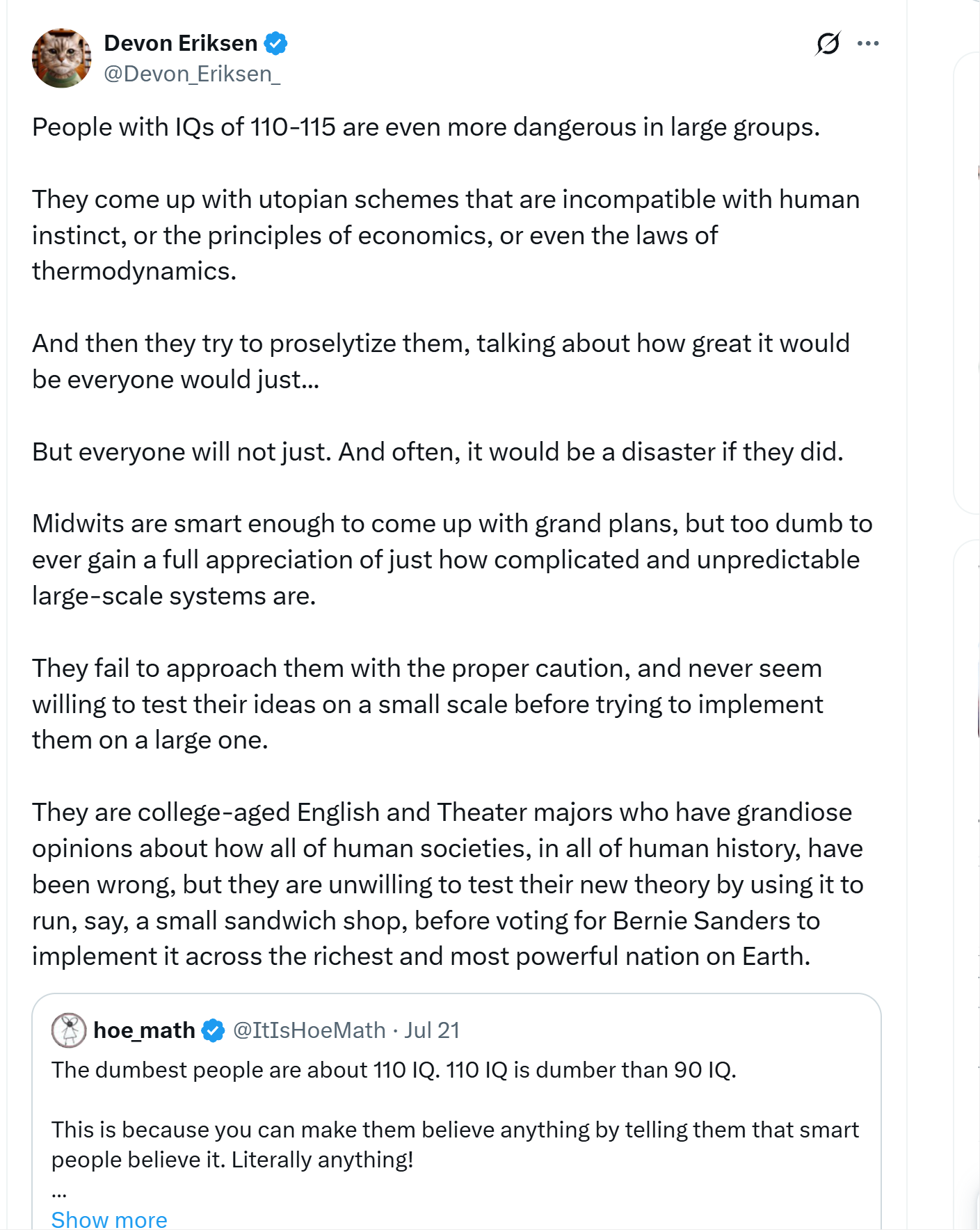 “no, no, no!” says the 2 std deviation intellect. “these midwits are fools mired in special pleading and the claims they make fail on second and third order principles and do not represent general case responses.”