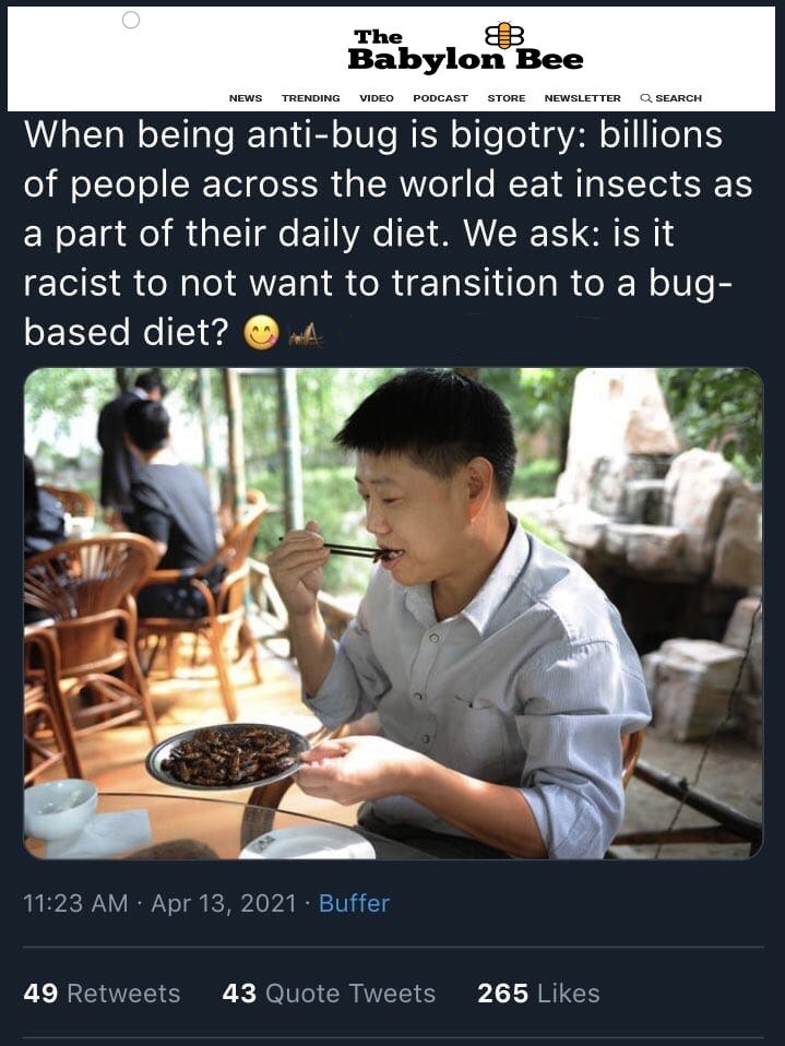 the worst part of all this is that as soon as you cave in and start eating bugs, you’ll immediately be accused of “cultural appropriation” and restaurants with white staff serving bugs will be picketed and hounded into closing.