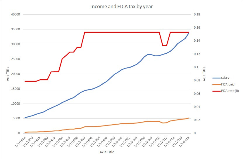 i took the median US salary by year and i multiplied it by the fully loaded FICA rate per year (individual plus employer contribution) which, it is worth noting, used to be much lower. it was only 7.9% in 1974 vs 15.3% today. from this we can calculate annual FICA payments into the system and aggregate them over a 45 year career to 65 which would end in 2018.