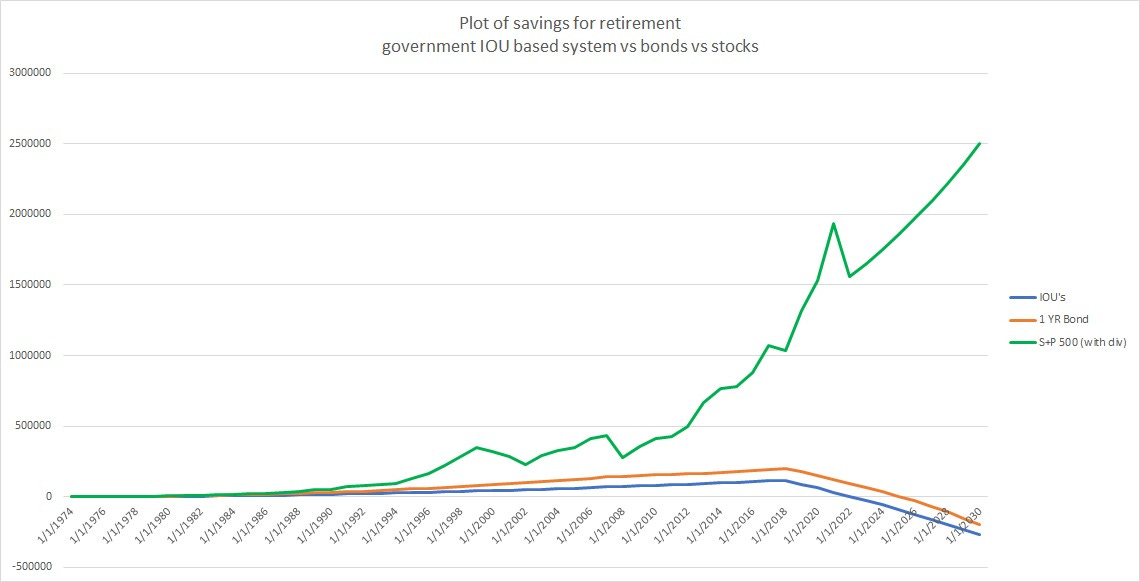 BUT, you can not only eliminate this but invert it radically by finding higher rates of return using equities. if one had put the money each year into the S+P 500 (with dividends) then by retirement in 2018, the savings would have been $1,032,696 and that is sufficiently high that even once you start taking out every year for SS and medicare, the overall balance keeps rising even using only an 8% return assumption (far lower than the 12.1% over the past 45 years). also note that this return series is the opposite of a cherry pick as it started in 1974, a terrible year in which the S+P was down 26%, so that’s about as bad a start point as one could choose.