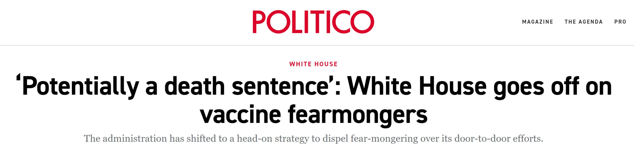 “The White House has decided to hit back harder on misinformation and scare tactics after Republican lawmakers and conservative activists pledged to fight the administration’s stated plans to go “door-to-door” to increase vaccination rates. The pushback will include directly calling out social media platforms and conservative news shows that promote such tactics.