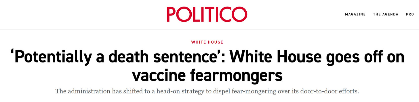 we’re dealing with people who cannot win the argument in open debate. they’re losing and they know it. they have lied about risks and lied about lying. they seek to silence opponents and are so divorced from reality that they see nothing wrong with sending missionaries to your house to hector you and check on you as though there was anyone in america who was unaware of vaccines at this point.