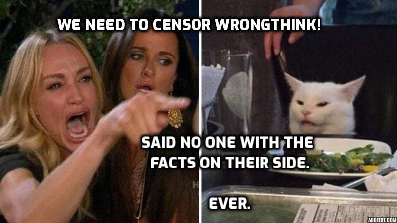 leaving aside the irony thick enough to stand a spoon in of the selfsame people who have done nothing but fearmonger for 18 months and that are currently pushing the extremely mild delta variant as some sort of existential threat (perhaps from death in a hyperbole singularity?) accusing others of spreading fear, i’d like to focus on the new censorship push: