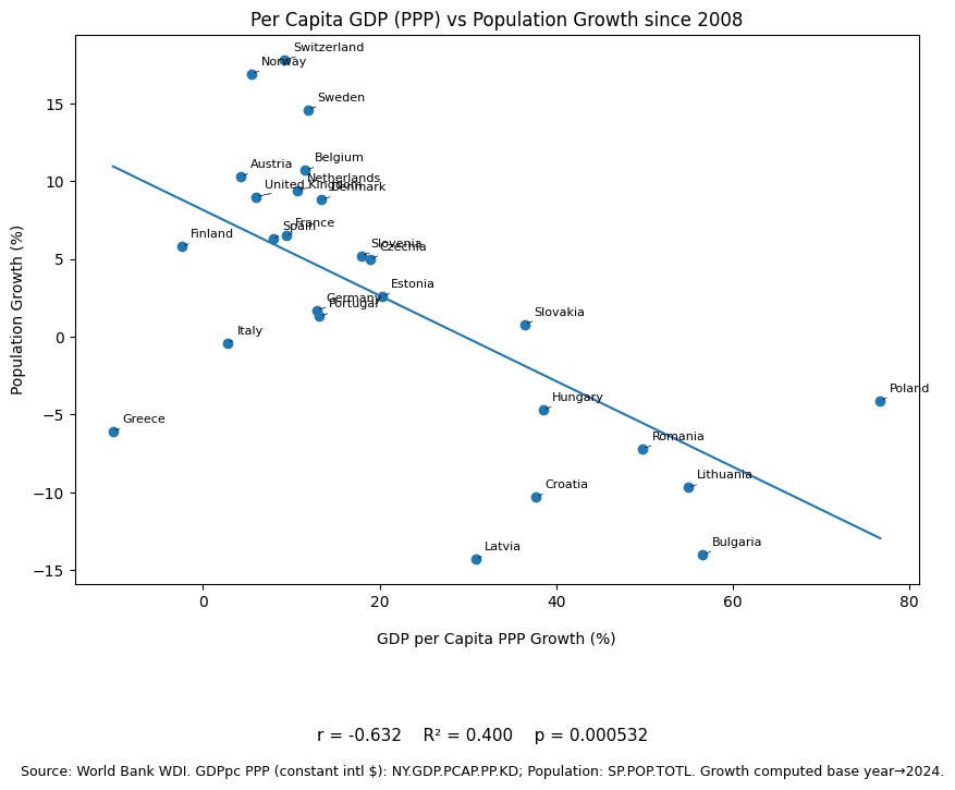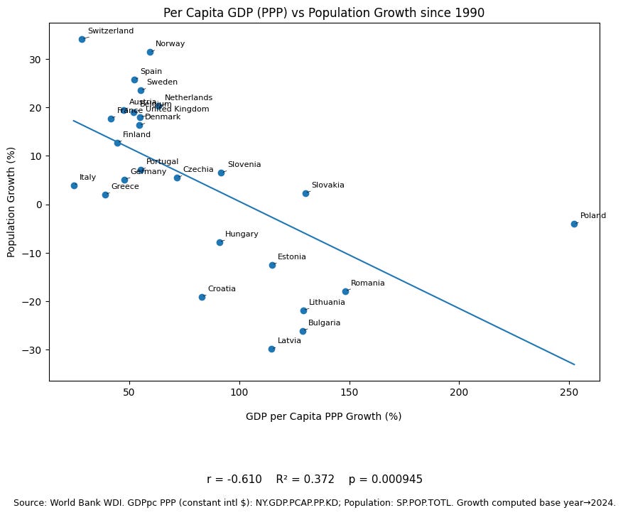 there is a strong (.37-.40 r2 is crazy strong for something this multifactorial) inverse correlation between population growth and growth in per capita PPP GDP and the p values are eye wateringly low. one could, if one sought to be maximally biased against this data claim that it’s an east/west dichotomy, but i find this unpersuasive because 1. even the EU shows no correlation between population growth and per capita GDP at PPP growth. it’s basicall orthogonal. and 2. the two have had radically different policies on immigration so far from being some sort of “rig job” i think it can be more properly termed “a natural experiment.” (and one borne out in japan and korea)