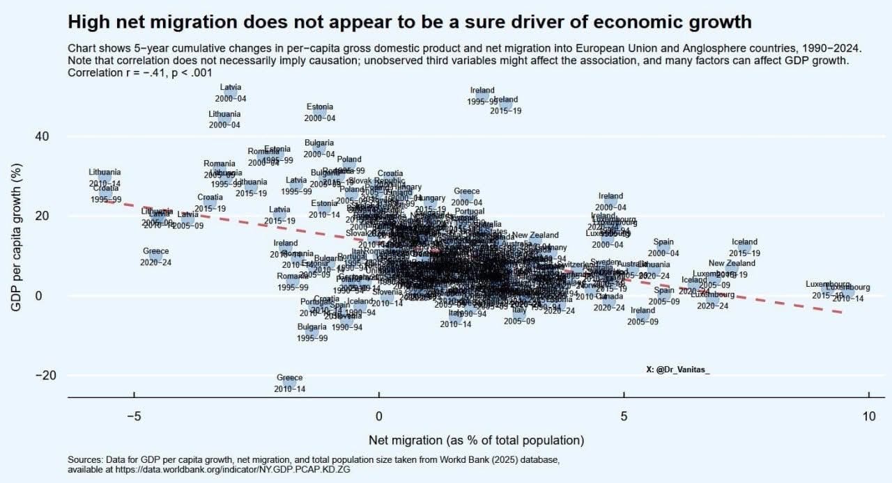 it turns out that basically no one is mass immigrating their way to per capita prosperity lately. all the problems, crime, and cultural issues, they are not bringing growth or well being.