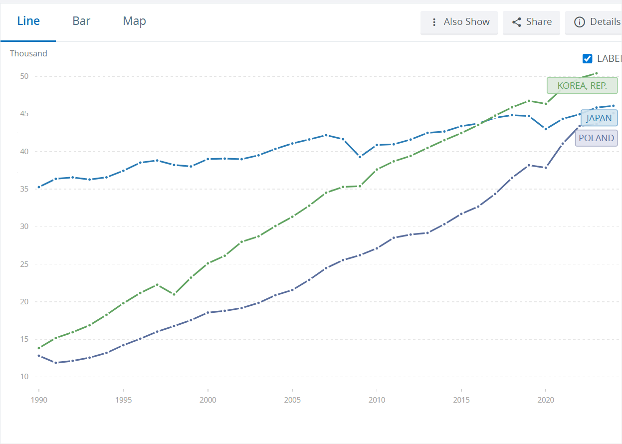 the best gross stat for this is per capita GDP measured at PPP (purchasing power parity). this measures a country’s output per person and then adjusts it for the local cost level. housing in warsaw is far cheaper than london etc.