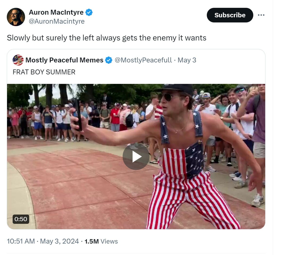 many seem cheered by the rise of “counter protest” on campus and while much of the anti-woke, anti-crybully wrecker action has certainly been laudable and i find myself cheered by and cheering for it (especially the newfound appetite for holding leaders and teachers accountable for the awful offal they have been shoveling), some of it seems to carry some very worrying undertones as well and if we’re going to be the side of civilization, then we may want to be sure that we sustain some semblance of seeming civilized.
