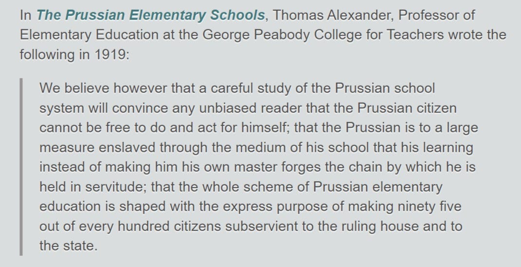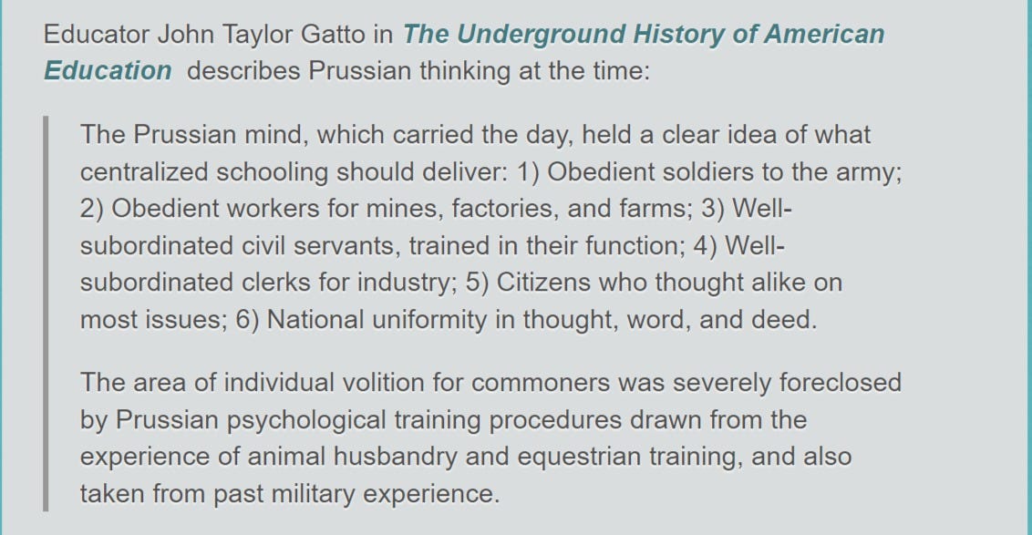 dating back to the early 1800’s, this has been endemic to US education because the american educators from john griscom to horace mann who pushed “compulsory school” were mimicking the regimented, top-down controlled, standardized, and most of all compulsory prussian educational system. our system is modeled on it to this day. does this sound familiar?