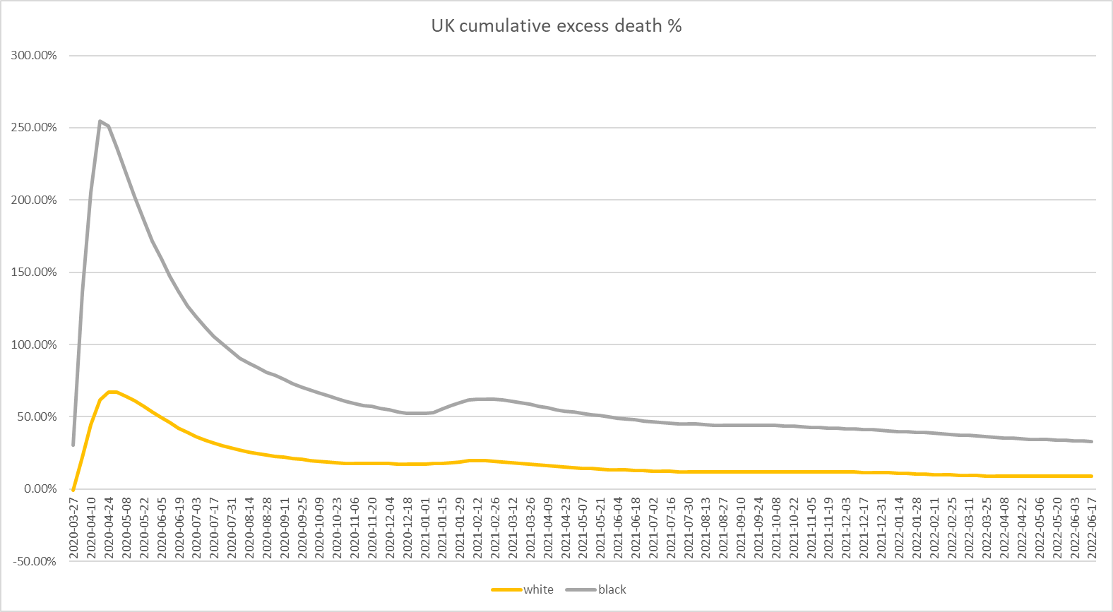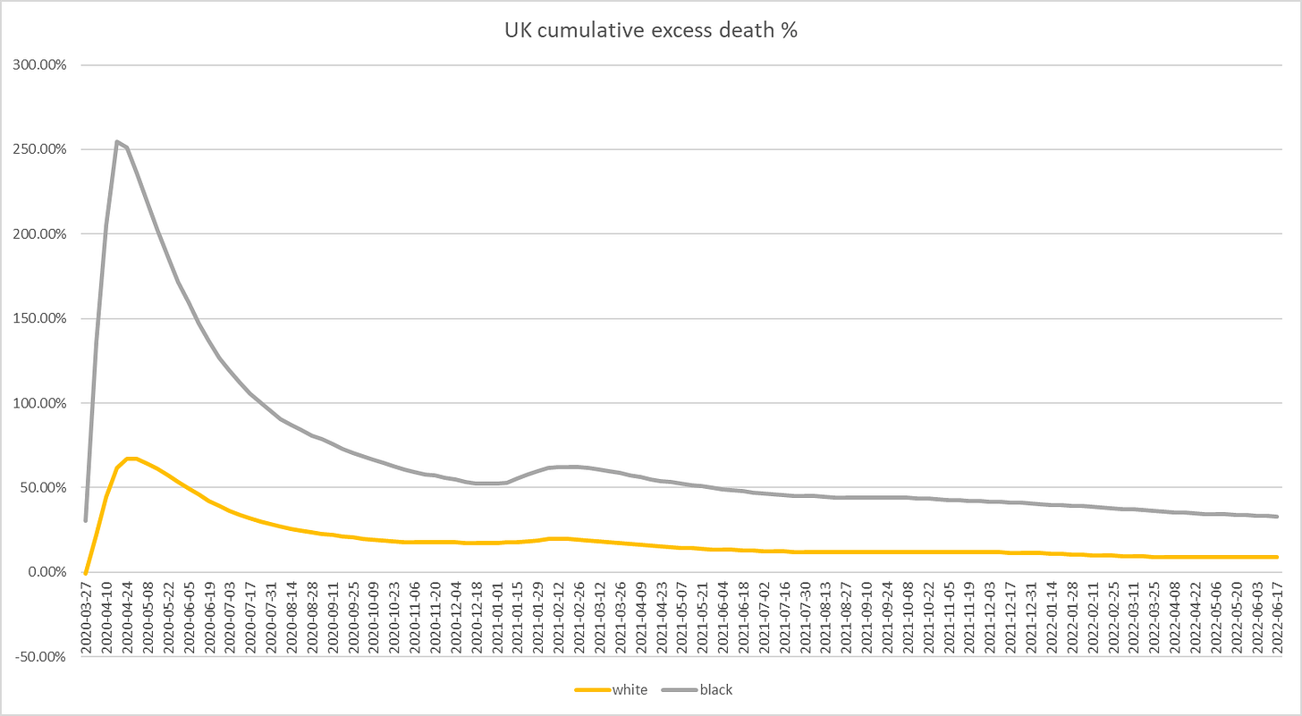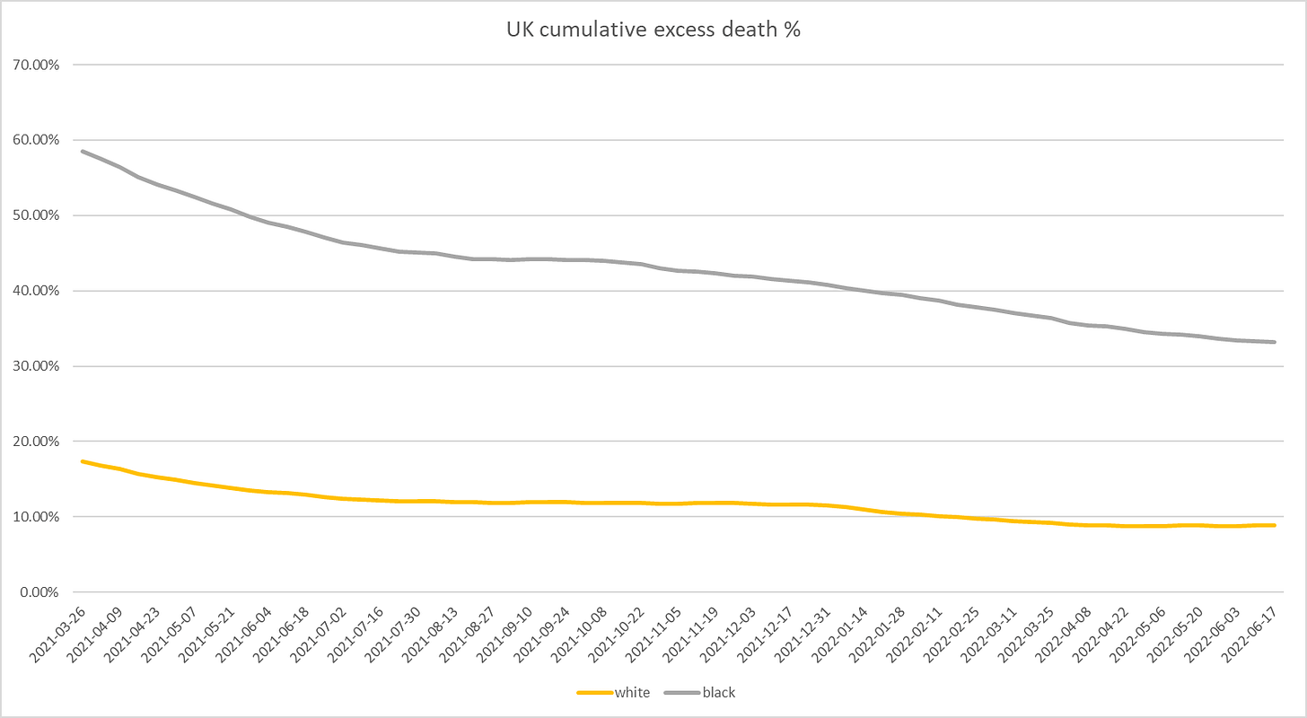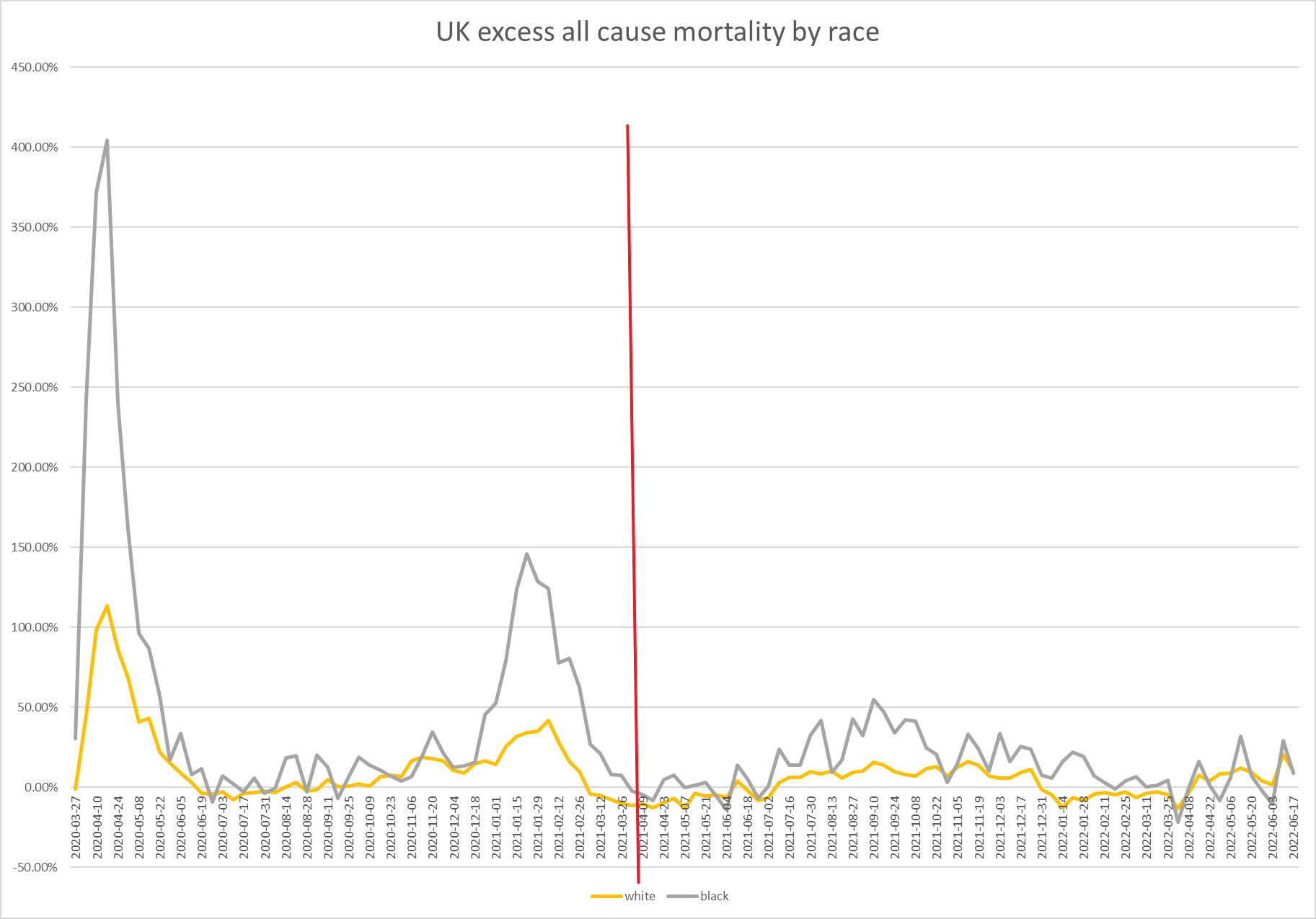 starting in march the BA.2 (and later) sub variants of omicron became dominant in the UK. and a few weeks later, the gap in excess deaths in the highly vaxxed white community and the low vaxx black community disappeared with great suddenness.