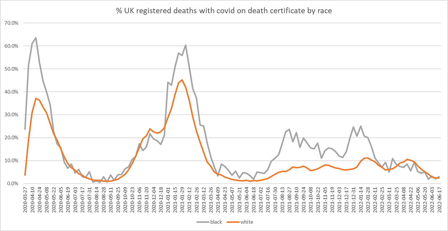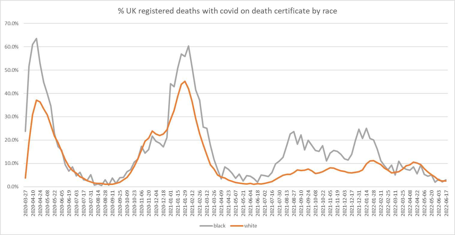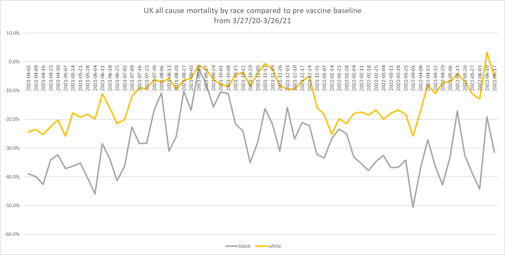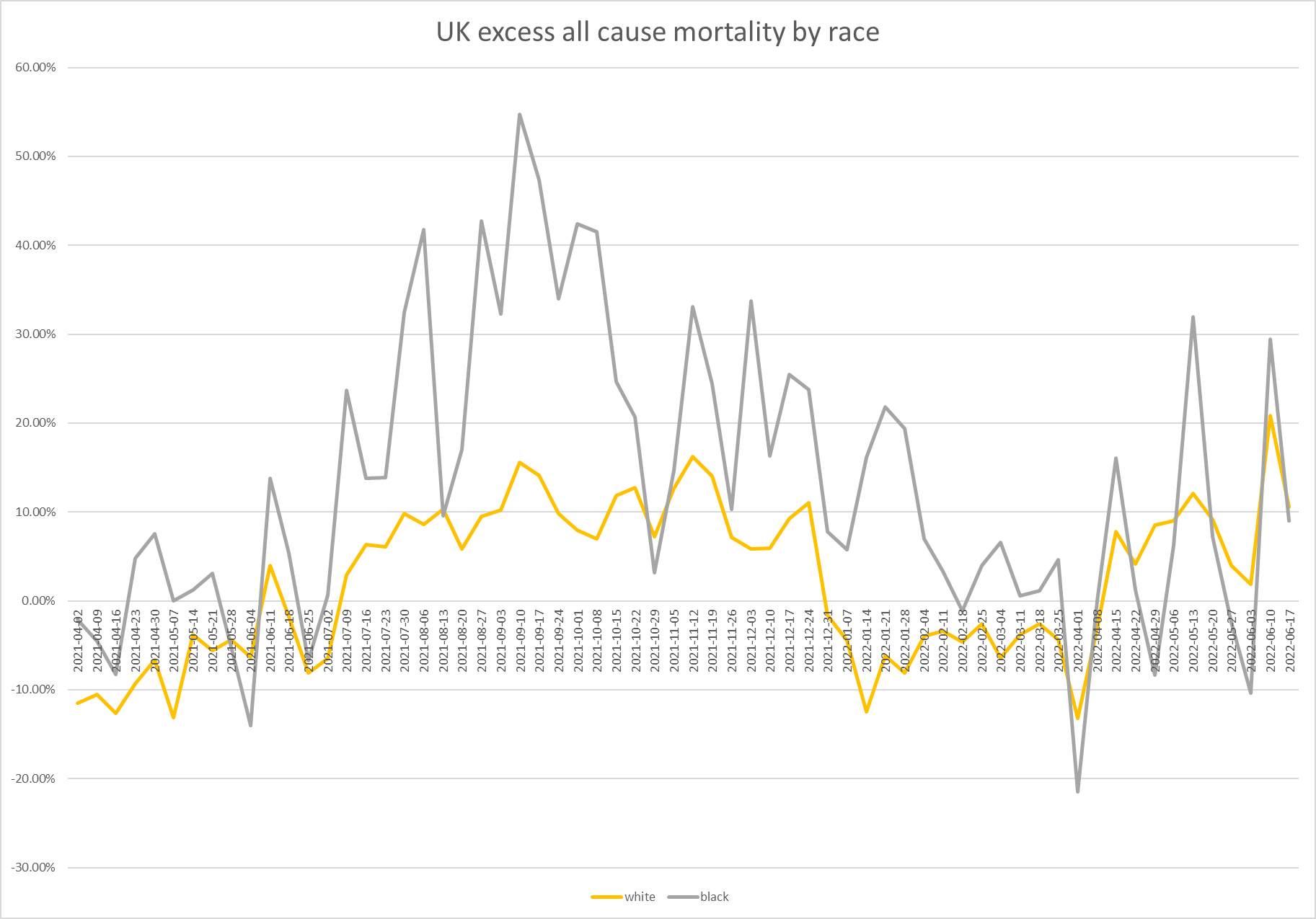 starting in march the BA.2 (and later) sub variants of omicron became dominant in the UK. and a few weeks later, the gap in excess deaths in the highly vaxxed white community and the low vaxx black community disappeared with great suddenness.