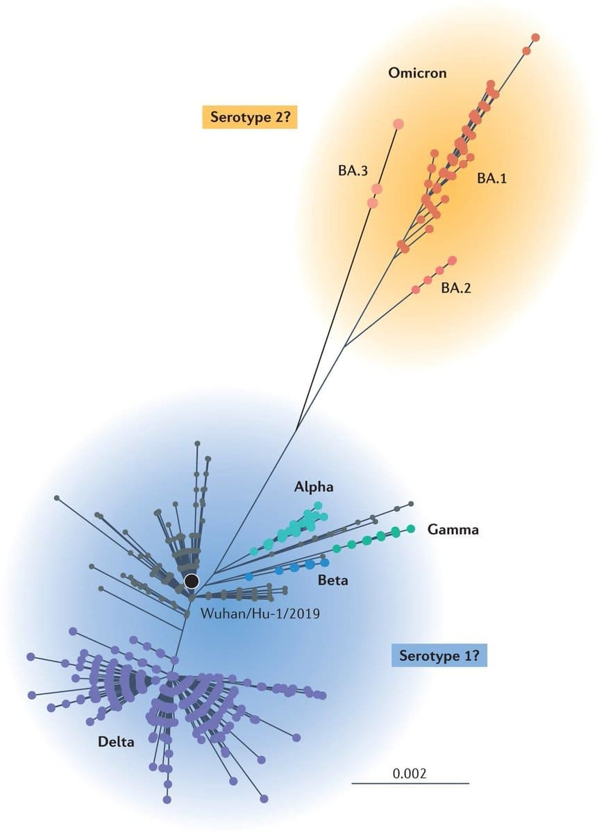 we’re into a whole new serotype and this occurred as a major throwback. some have presumed that this must indicate that omi was another lab escape, but i suspect another explanation may better fit: omi was a failed minor sub-mutation that had been around but was going nowhere. then, the vaccines changed the game. the antigens of omi were suddenly highly advantaged and so it spread like wildfire using the fixated immune response of the vaccinated to do so. “would omicron ever have come to prevalence without covid vaccines?” is actually quite an interesting question. (i’m not sure anyone knows for sure)