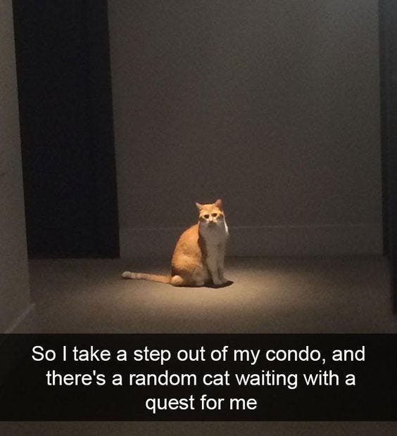 sunday meme-questcome on the journeyel gato maloSep 24, 2023∙ Paid257243Sharewill you accept?because cat quests are a fine adventure if you get the right guideThis post is for paid subscribersSubscribeAlready a paid subscriber? Sign in