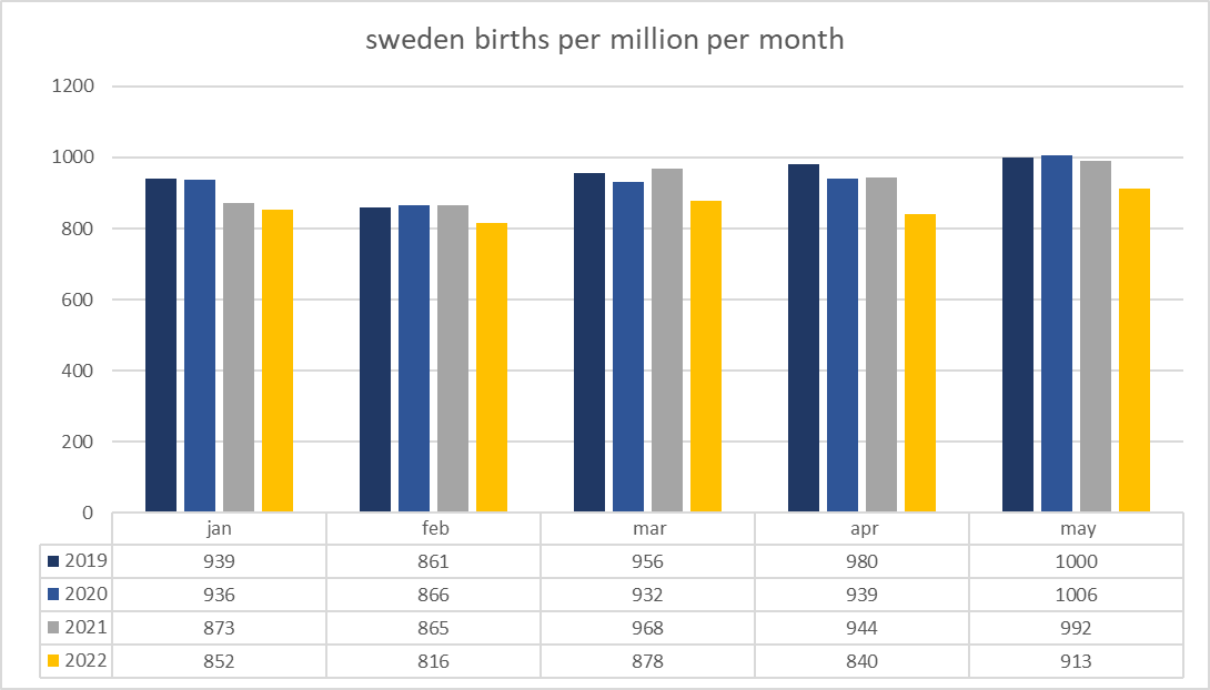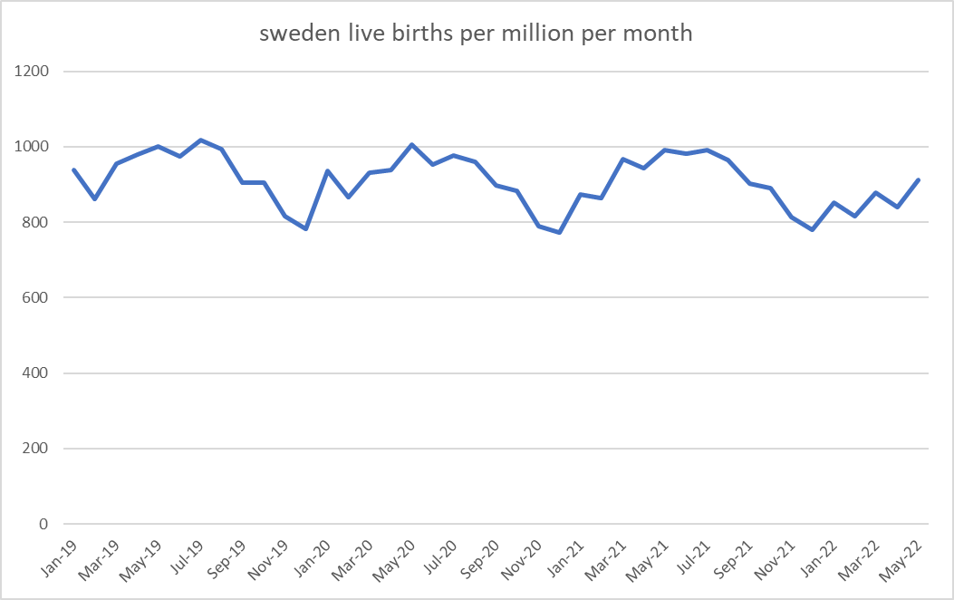 there are issues that favor each and i’m not sure the may data can really resolve it for us as babies born in may 2022 were conceived around august 2021, the peak of euro (and swedish) vacation, but we can start to frame the issue.