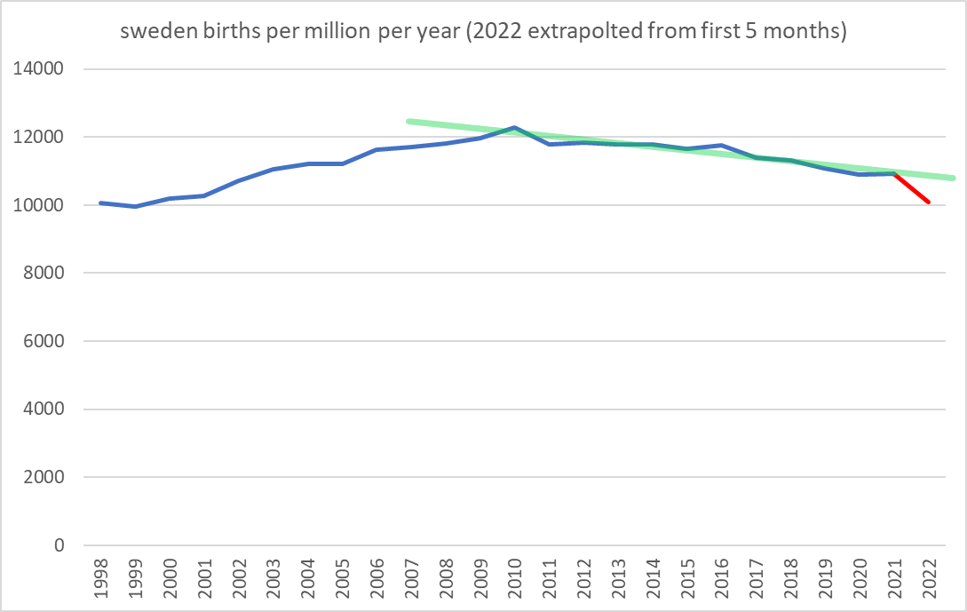 sweden has been in a ~12 year downtrend in natality and i have sought to account for that by adding an (admittedly arbitrary) green trend line to establish baseline trend.