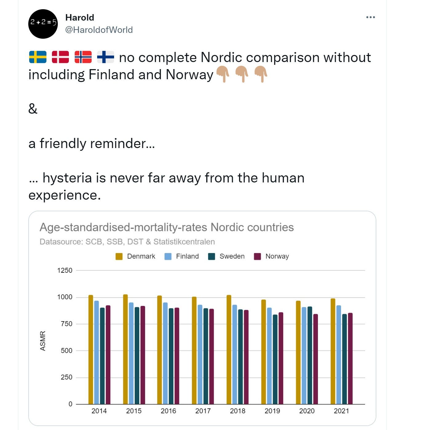 to put that in perspective, sweden had 6,583 reported covid deaths in 2021 and this number is infamously over-counted as sweden calls any death for any reason within 28 days of a covid positive test (whether or not it had symptoms of contributed to the death) as a covid death. test positive but asymptomatic then get hit by a bus 2 weeks later, that’s a covid death.