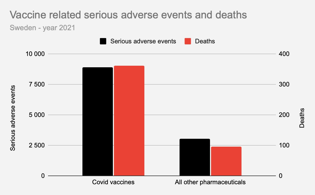 as can be seen, reporting to the swedish version of VAERS shows that over the course of 2021, covid vaccines caused more than 3X the serious adverse events and deaths of all other vaccines and pharmaceuticals combined.