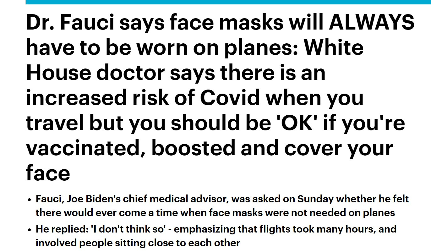 tony, “no need to wear a mask on a plane” fauci now says you may need to wear masks on planes forever.