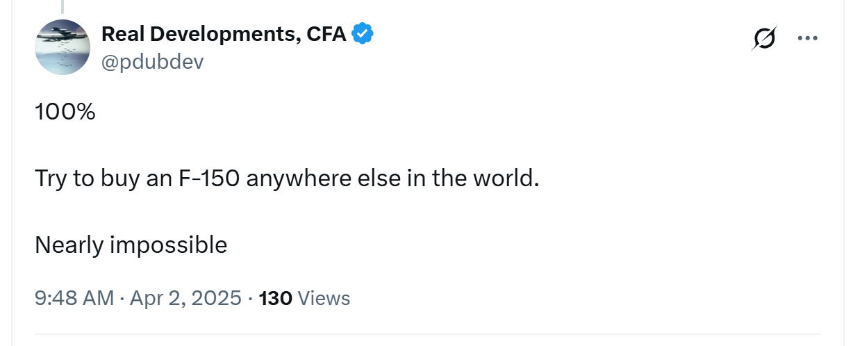 trump loves this because he loves making deals. you buy from caterpillar and i’ll drop the tariffs. but the desirability or justice of this is severely lacking. it forces commerce. this breaks the efficiency and pareto optimality of trade systems and the validity of the price mechanism. it’s also “the US consumer gets screwed so i can play to special corporate interests.” great for CAT and the few folks who get new jobs, but what about everyone else caught up in the trade war? who makes it up to them? a net overall loss is still a net overall loss and this idea that we’re going to arrive at free trade for all looks fraught.