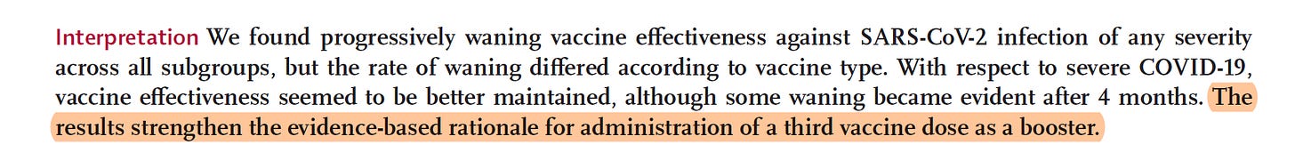 “efficacy wanes, so boost” is not a valid argument unless we know that boosters work, yet any evidence that boosters actually do anything to help is absent and all past data shows such rapid fade on efficacy vs severity as to make boosters a poor appearing proposition.