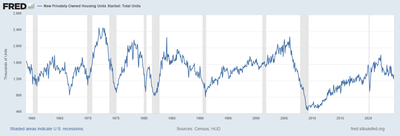 and the annualized rate is dropping like a rock. it’s now 1.2 million. this purportedly vast influx of new labor is not even keeping housing production at the level of the 1980’s when the US had 100 million fewer people. (230mm vs 330mm now)