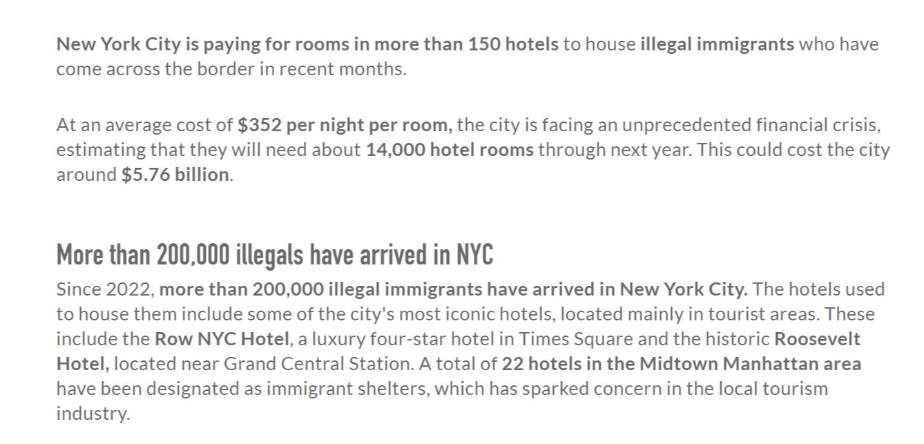 i’m not sure anyone really knows, but some estimates place the housing cost for putting up illegals at $451 billion in 2023. if this is even close to correct (and it could be) that that’s a staggering number, nearly 8% of the federal budget. (though a lot of this was paid by states or localities)
