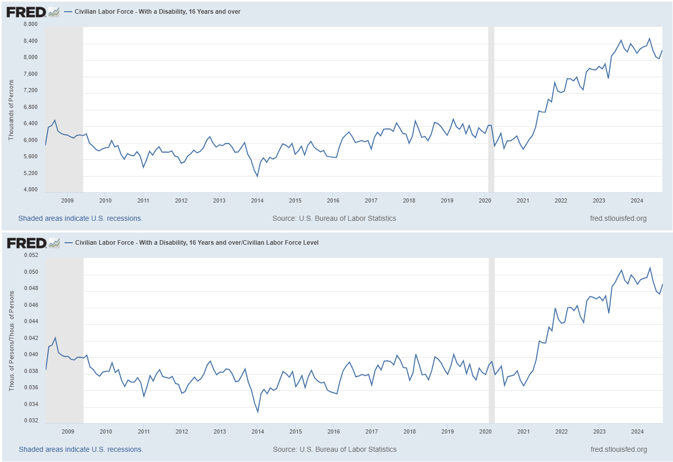 2.7 million people started claiming “disability” from jan 2021 to aug 2023, 1.5% of the US workforce (the bottom graph is just the top graph divided by US labor force). 5% of working age folks are claiming “disability.” this is a staggering number with no historical precedent in the US. standard for making this claim dropped like a rock and the length of benefits soared. cough a bit, say you feel unwell, mumble “long covid” and off you go.