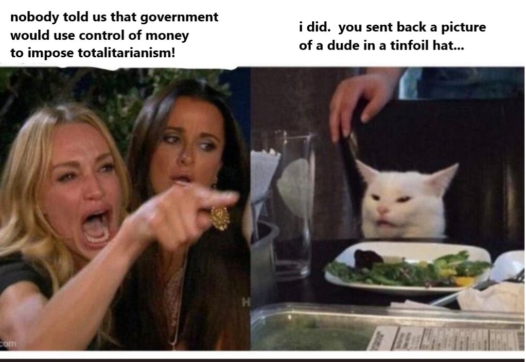 governments are not only disastrous stewards of fiat currency, but they are increasingly weaponizing banking and transactional systems. it is the ultimate lever of control. the tax farmers control everything about this ecosystem from field to table. they see it all. they may grab what is yours any time.