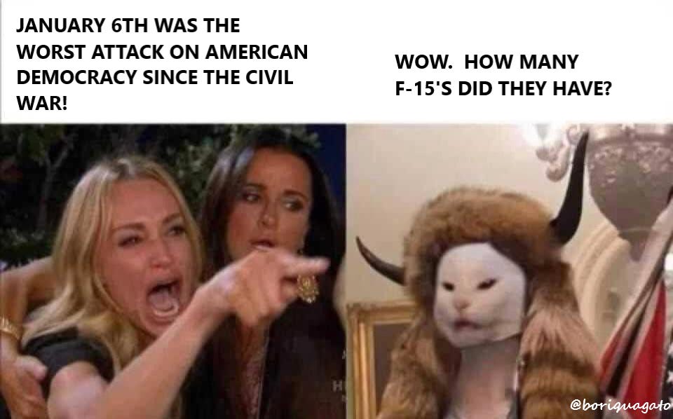 the same people who claim “you need nukes and fighter-planes to take on the US so why bother having guns?” turn around and tell you that unarmed cosplay shamen sitting in a chair nearly unseated the federal congress.
