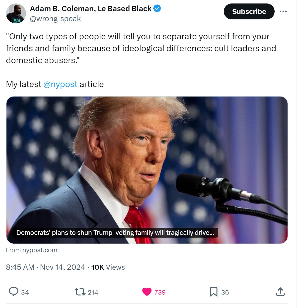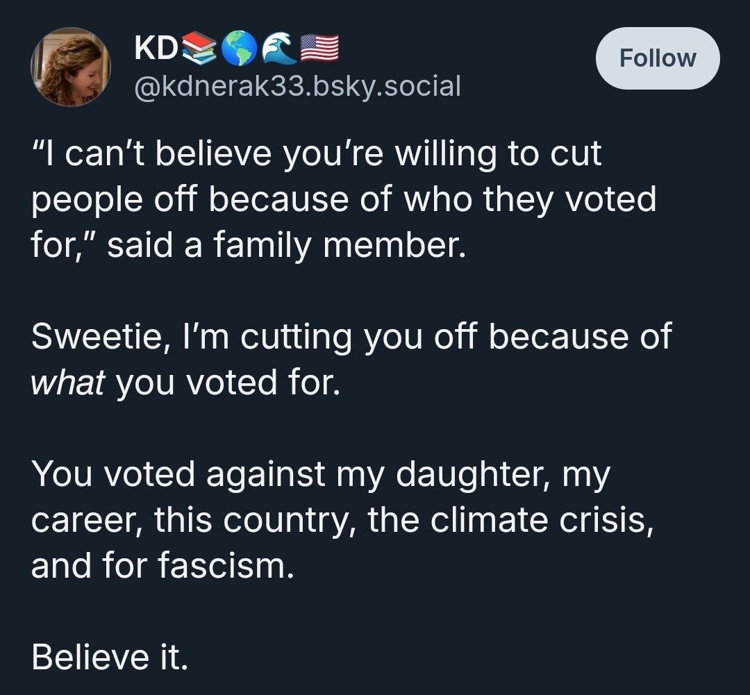 I got an earful of this sort of thing in my book group meeting just last night. One member announced— first thing she said after she took off her coat and stomped into my living room— she had arranged to celebrate Thankgiving WITHOUT the Trumper relatives, they were disinvited, and it would ONLY be people with whom she could stand to be, and they would all grieve.