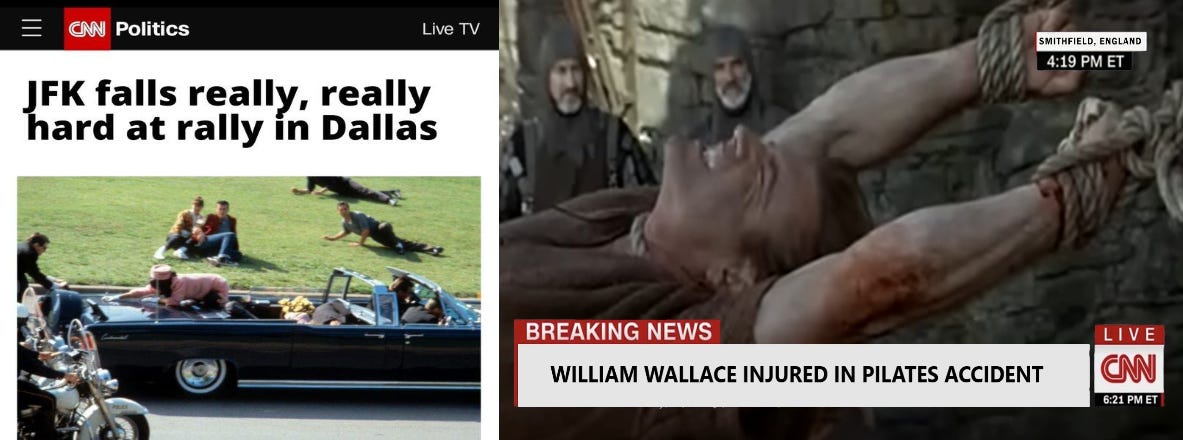 hell, they tried to make it look like a fall to make him seem as frail as joe. this does not play well with the bloody face fist pose of a guy who just got shot and is having none of it.