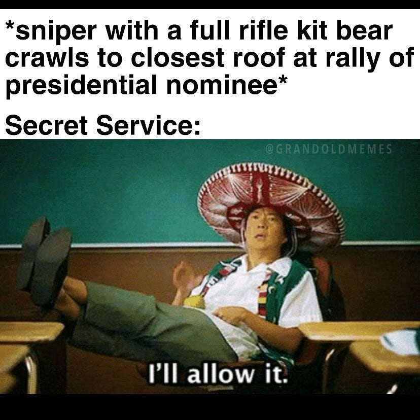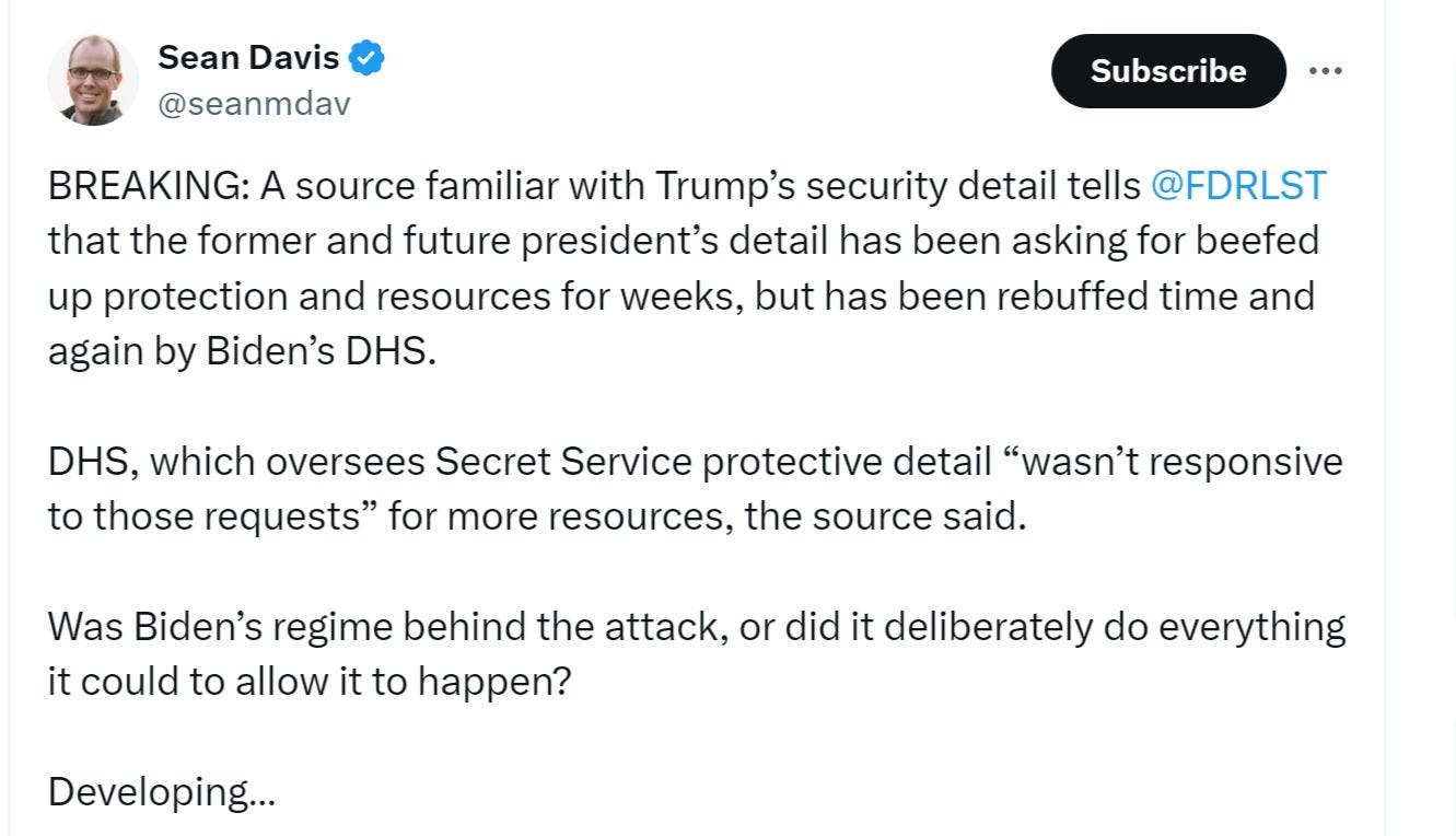 but the folks who were recently advocating for rule changes that could strip donnie of SS protection altogether “because he’s a felon,” well, that’s not a bill i’d want my name on just now. nor would i want to be one of the ones who kept saying no to trump’s apparently repeated requests for more protective staff (his detail was small and badly overworked).