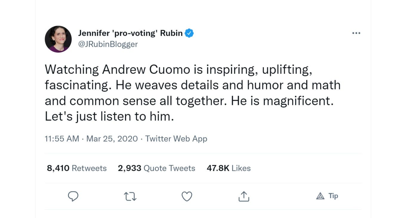 either puckish prankster (and gatopal™) jay bhattacharya has hacked her twitter feed, or even jennifer “pro-hysteria” rubin is now sounding like a signatory of the great barrington declaration.