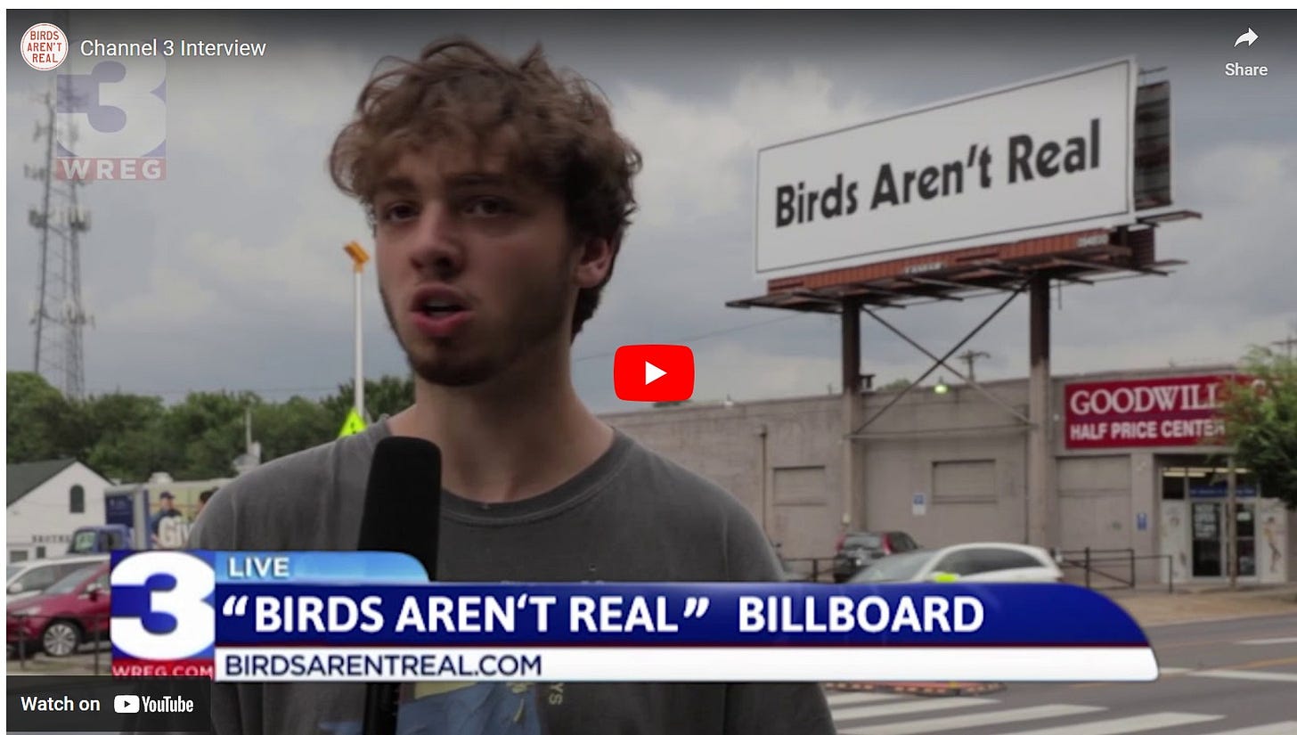 it’s a fun theory and a fun way to create a sort of combo of zeitgeist and lightning rod for the gray faced stickybeak literalists to rail against. it’s the move to take absurdity one step too far and expose it for what it is and the sort of mockery against which there is no defense. it’s a humor revolution of taking the piss to galvanize us. i owned a “birds aren’t real” hat long before the NYT article and i confess i sort of miss the ambiguity, but i love the movement. the best way to rebel against the tediousness of totalitarians is to ostentatiously amuse oneself with irreverent gusto.