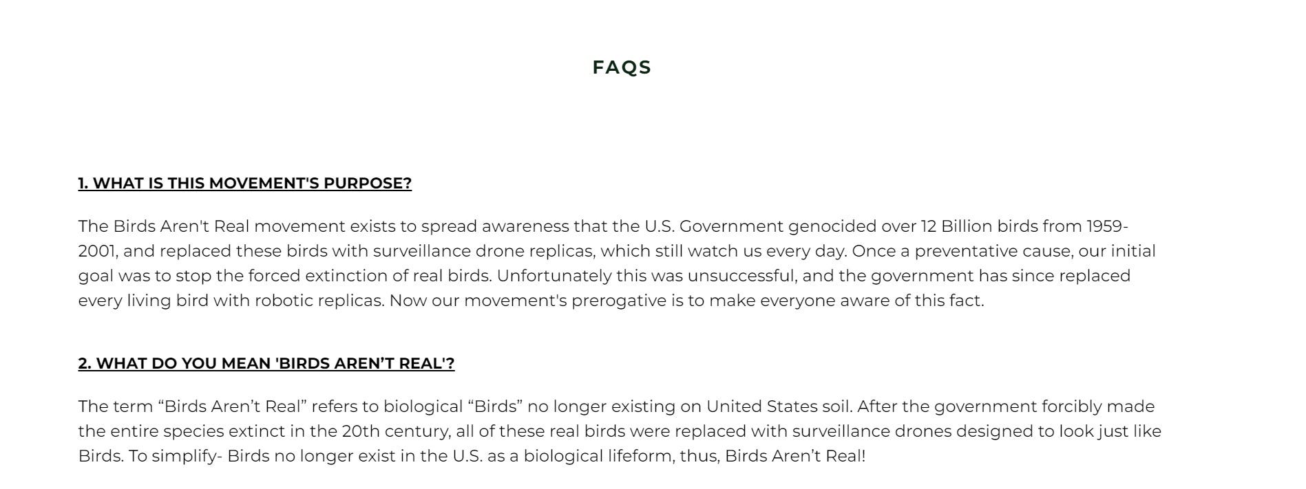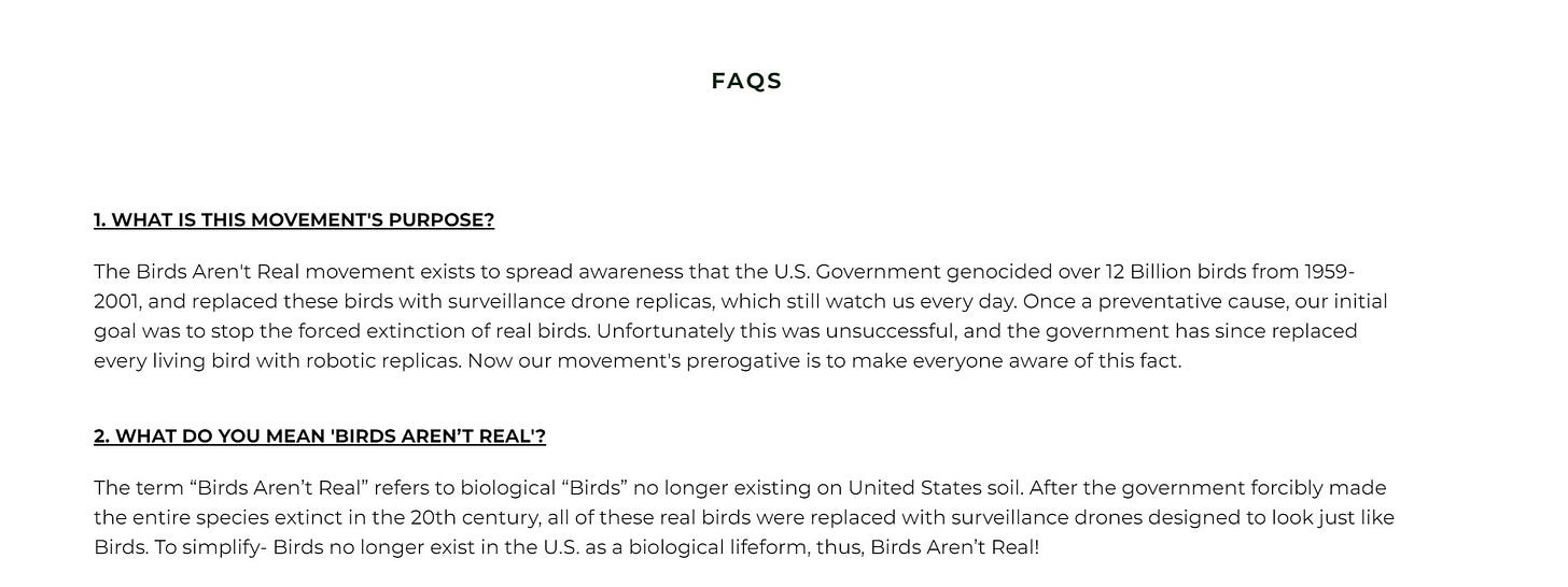 the author(s) were for a long time so assiduous about never breaking character that i had no idea if they really believed this or it was just an awesome, epic troll that had become a nice business selling hilarious merch. the dude literally drove around in a van with a radio dish on top and “wake up: birds aren’t real. they charge on power lines” written on the side.