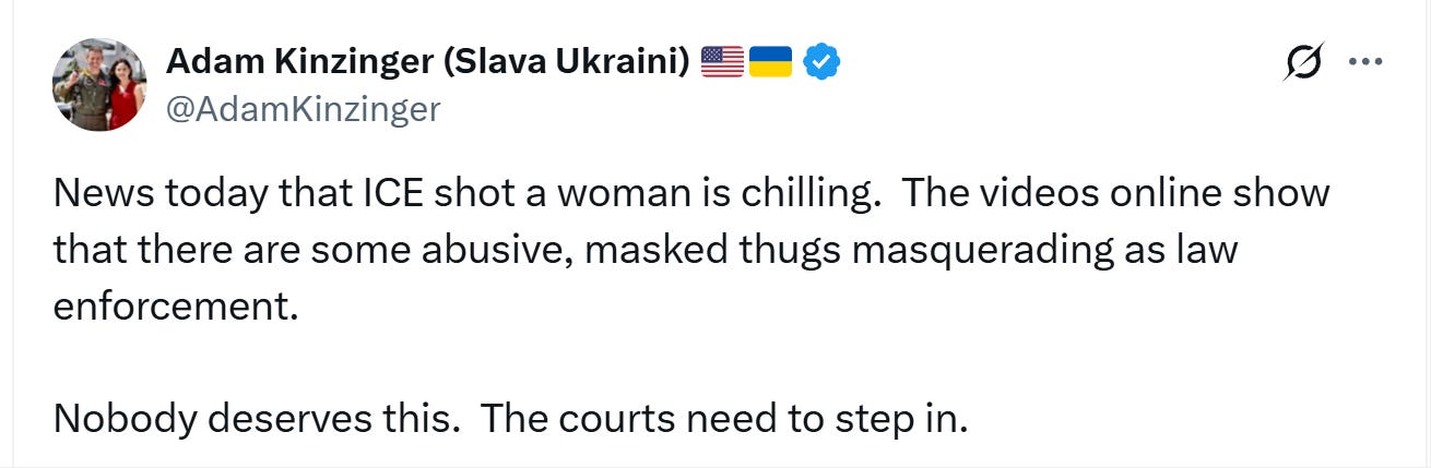 yes, indeed, a “woman got shot.” that woman was marimar martinez. it cannot be an accident that adam is leaving out the context that she (and others in her group) had been driving erratically around the ICE vehicles, boxing them in, coming inches from them and behaving in a highly threatening fashion even running red lights and driving the wrong way on one way streets to do so before they, wait for it, rammed the ICE vehicle with multiple vehicles of their own. (report on this)