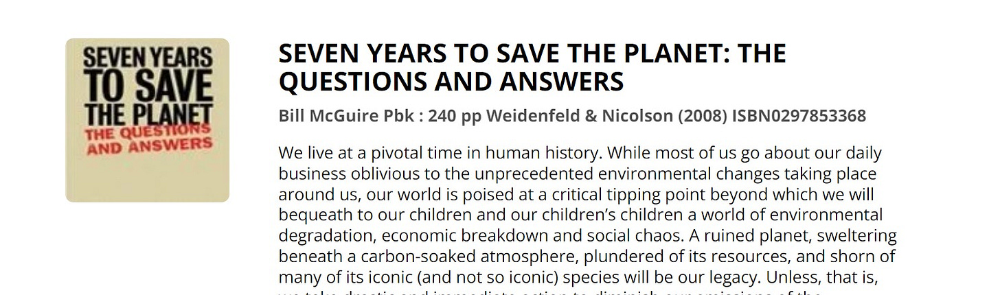 keep that “speculative fiction” gobbet in mind as we range onward because i have some questions about just where to draw a line on that and whether or not mr bill can (or chooses to) discern the difference between such fiction and that which he seems wont to present as “fact” like ideas that “climate change causes earthquakes” and this all too predictable gem in the mode of “world ending climate catastrophe always 5-10 years away, since 1963” entitled “seven years to save the planet.”