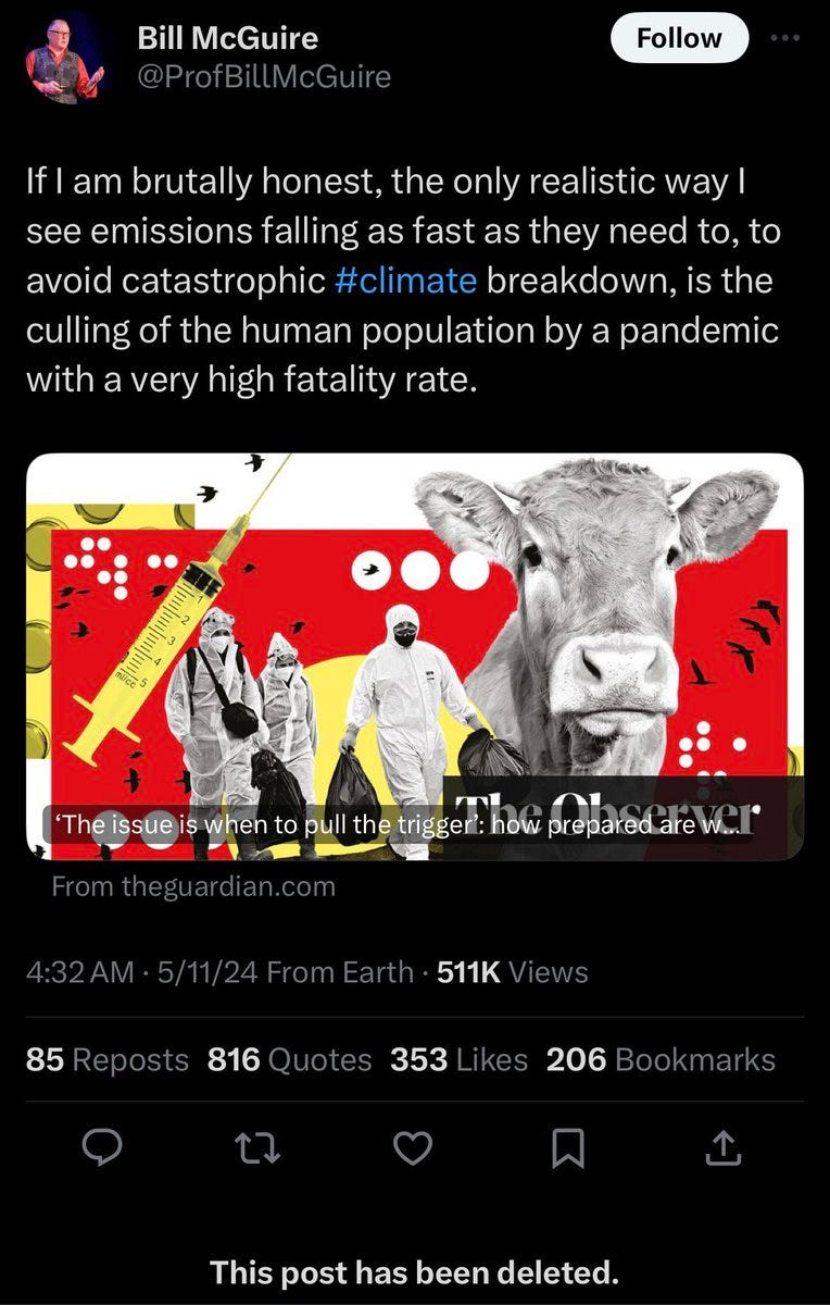 so it’s all a bit unsavory, but does not quite convict this bill (perhaps unlike certain others of his namesake) of “wanting to kill most of us.” but this is not exoneration either and clearly, some of the more avid among the eco advocates do explicitly champion precisely such things and have been doing so in misbegotten malthusian fallacy for 50 years or more. the jury may still be at least a bit out on just what bill would prefer to see here, but given the astonishing and relentless shrillness of his anti-capitalist gaia style twitter ejaculations (the man reads like the eric ding of climate) there would certainly seem to be grounds for interested inquiry.
