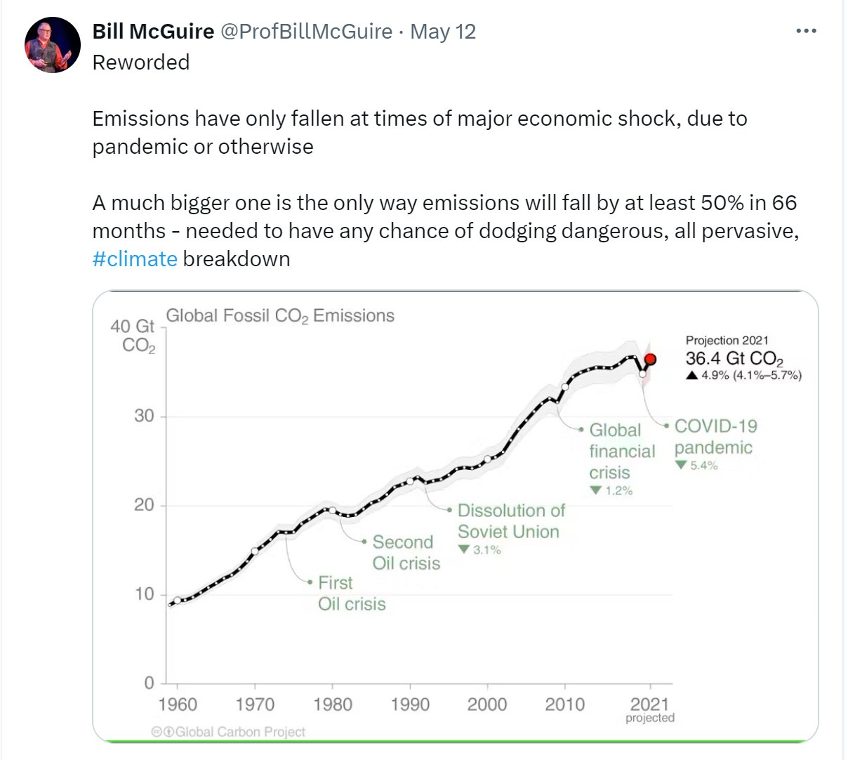 what we may, however, convict billy mcguire on is being a bad scientist, a sensationalist, and misusing data to push spurious claims. to wit, let us examine his “rewording” in which once more the horror hobgoblin of “all pervasive climate breakdown” in the remarkably specific next “66 months” (seemingly we’re now down to 5.5 years from the 7 claimed in 2008) is supported with a bunch of poorly measured and damn near unmeasurable assumptive claptrap about “global fossil CO2 emissions” as though this were some measured or measurable value as opposed to an imputed figure rooted in presumptive models.