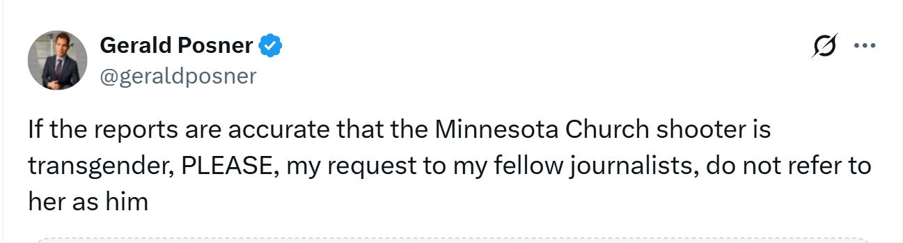 last week in minneapolis, this 22-23 (reports vary) year old biological male DBA “robin” the trans-woman shot up a church full of schoolkids. his weapons were bedecked with trans and anti-trump regalia and he left behind a manifesto of wild claims and violent ideation as well as missives about wishing he had never been brainwashed into trans but feeling unable to renounce for fear of consequence and censure.