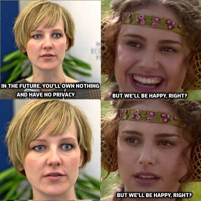 consider the outrageous density of this. you likely know the meme, but instead of aspiring sith-lord annikin, you get dead eyed ida auken, author of the WEF’s infamous treatise. the comparison to the dark side is instant and the refrain of “you’ll have no privacy and own nothing and be happy” skewered as the implausible tripe it is and hung with sinister overtones of darth vader.