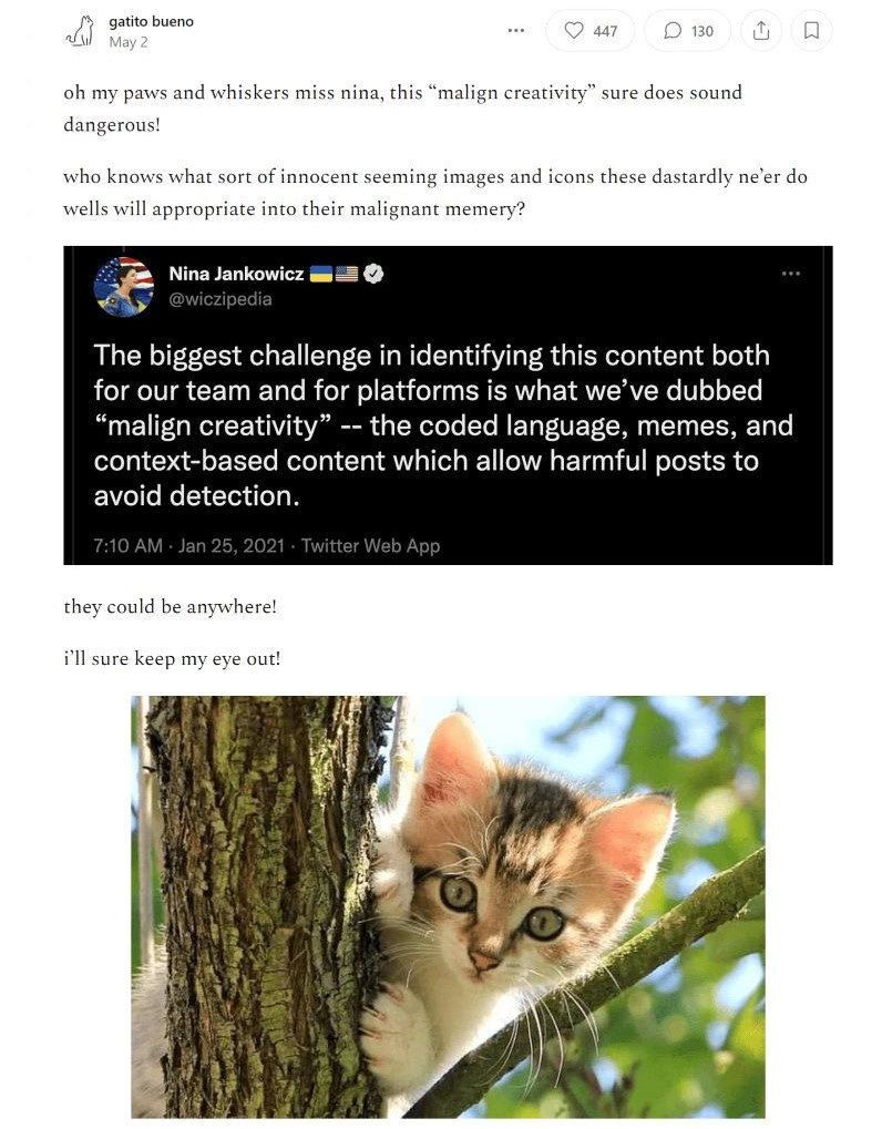 no sooner do you utter the phrase “malign creativity” than there are 200 memes that have adopted it as their own gleefully boomeranging it back at you.