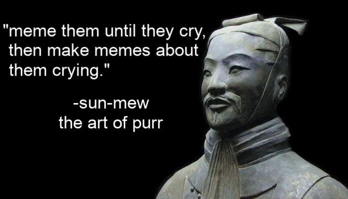 I have written many times over the last decade- ridicule is extremely potent against tyrants of all types. They do not like being mocked, and memeing does this like no other form I have seen.