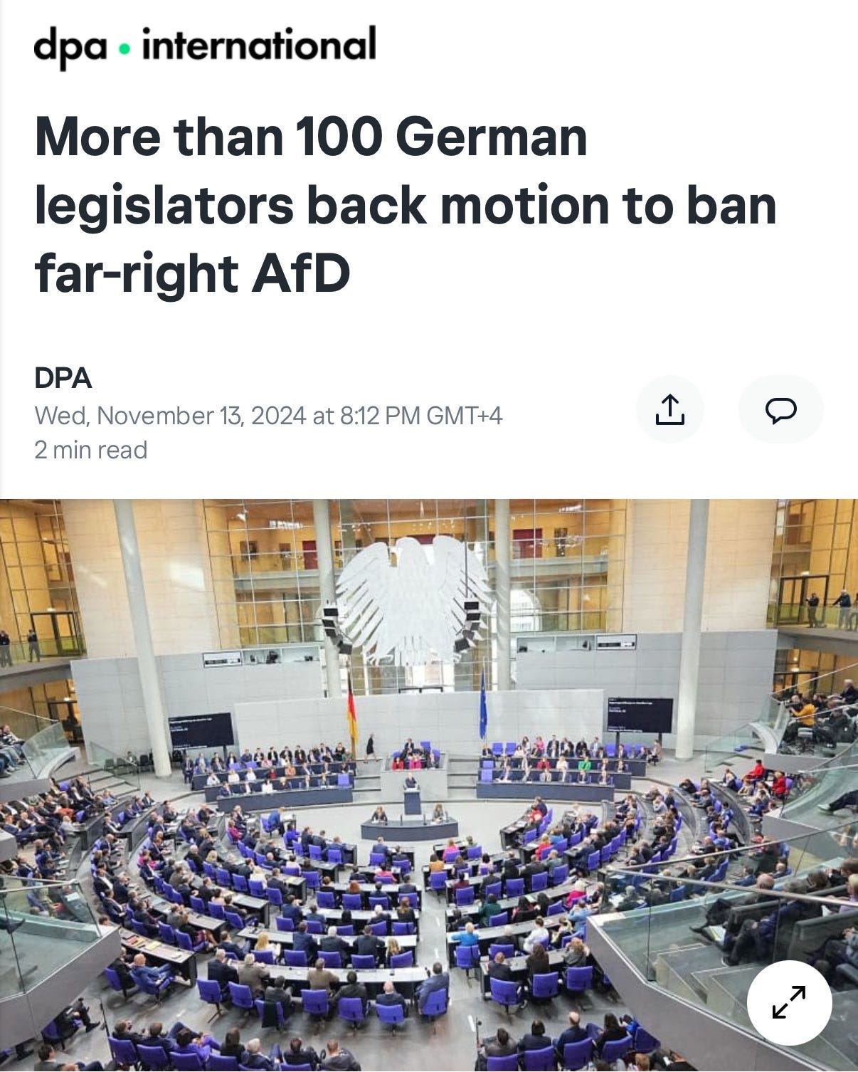 it’s pretty wild watching the germans flirt with “banning popular political parties to save democracy.” for a group so ostensibly touchy about their fascist past, it seems a remarkably tone-deaf flex.