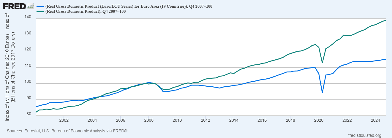 i set both euro area (blue) and US (green) to 100 in q4 2007.